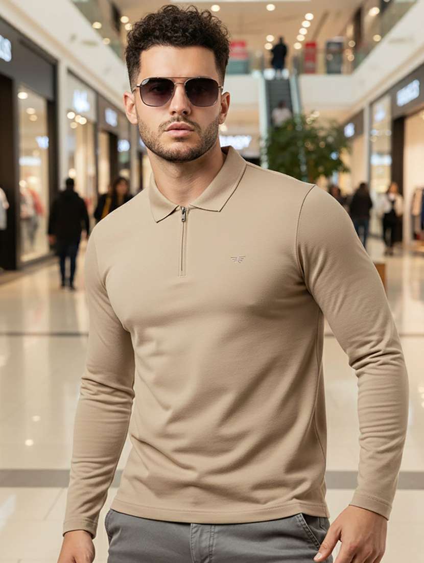 Long Sleeve Beige Solid Polo T-Shirt