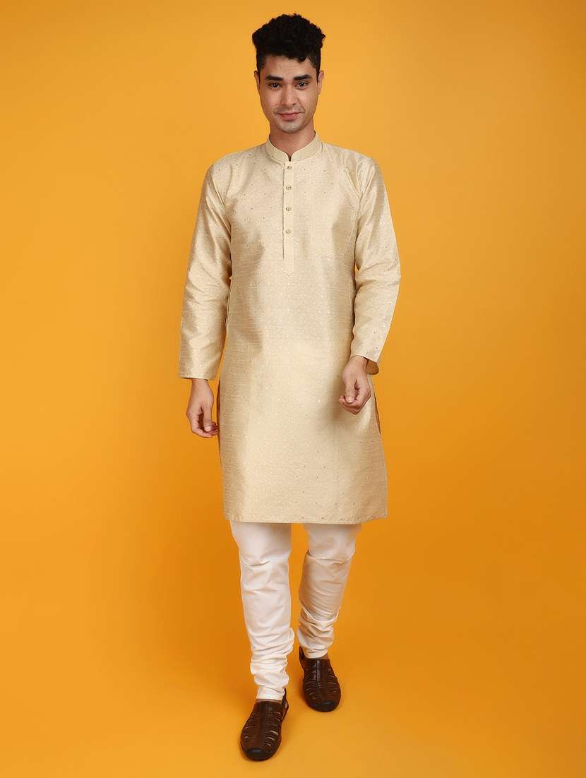 This Trendy Men's Kurta Pyjama is perfect for the men who is looking for some trendy outfit for festival or wedding. This men's Kurta Pyjama is made in a fined quality silk fabric with a mandarin Collar and sleeves. Complete the look by adding a traditional shoes. Model is wearing Size M and is 5'11\" in height.