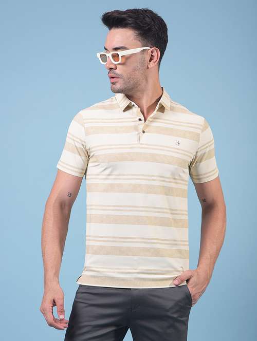 Embrace a relaxed yet polished look with Crimsoune Club men's beige horizontal stripes polo neck T-shirt. This comfortable polo features a classic stripe pattern, perfect for casual outings, ensuring understated style.