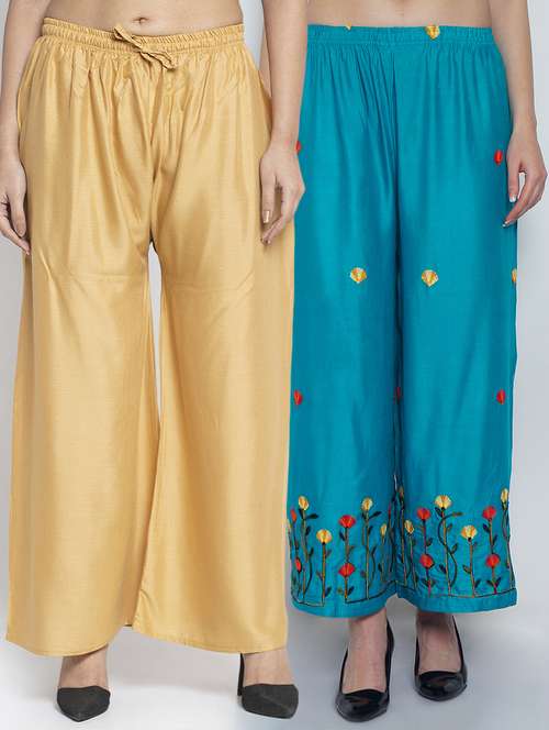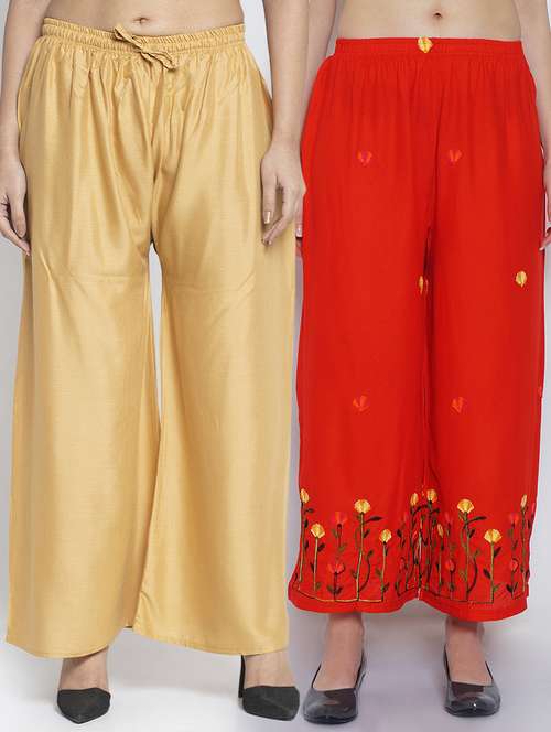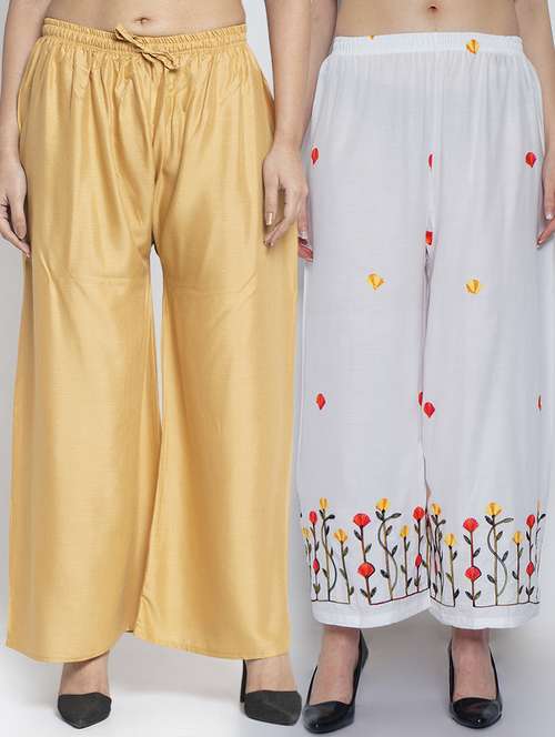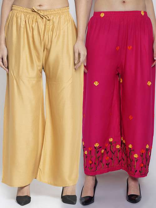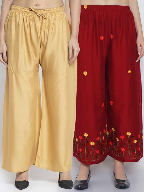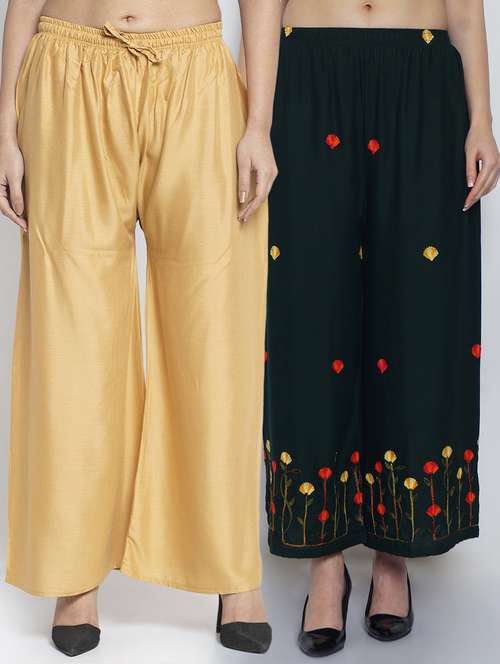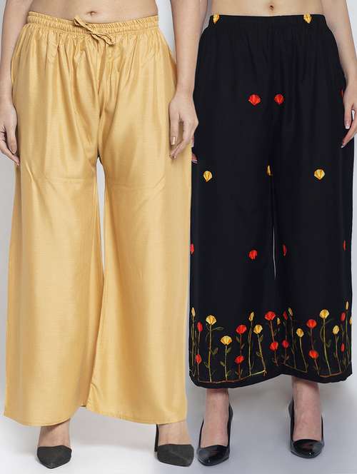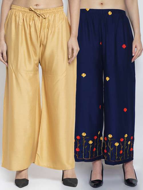 Women Rayon embroidery Print & solid palazzo are a stylish piece of casual clothing. Featuring a mid-rise, soft, elasticated waistband - these palazzo promise a perfect and comfortable fit. Available in many shades, these pair well with indo-western tunics and Kurti.