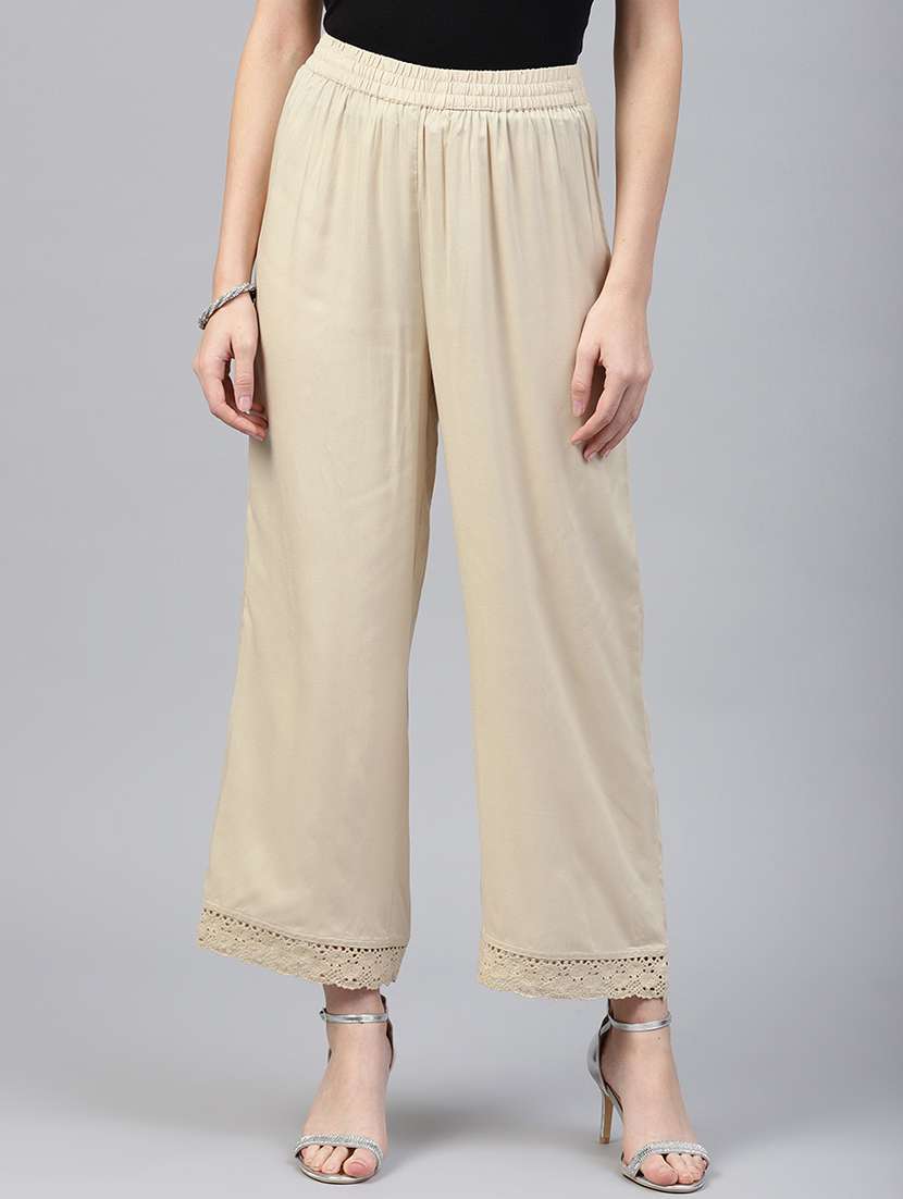 Juniper Beige Rayon Solid Wide-Leg Palazzo with Lace Embellished Hem