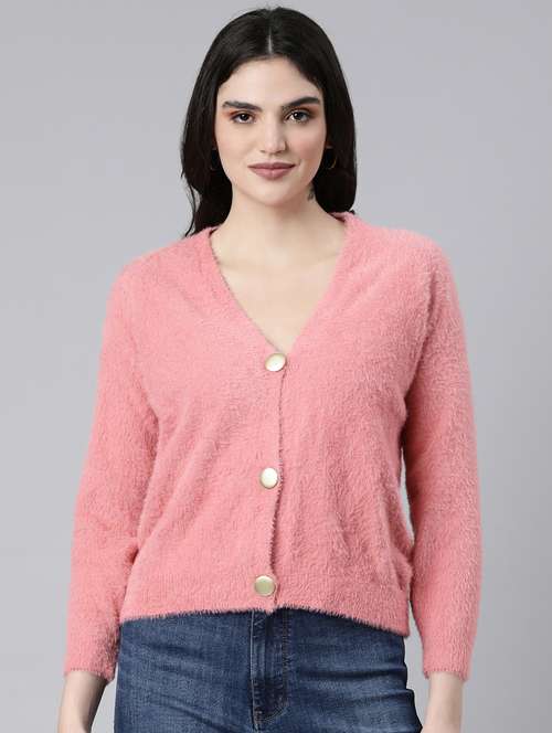 SHOWOFF Women's Long Sleeves V-Neck Solid Black Crop Front-Open Sweater