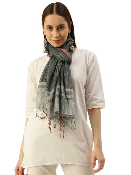 Grey And Brown Striped Scarf With Side Taping, Has Tasselled Border