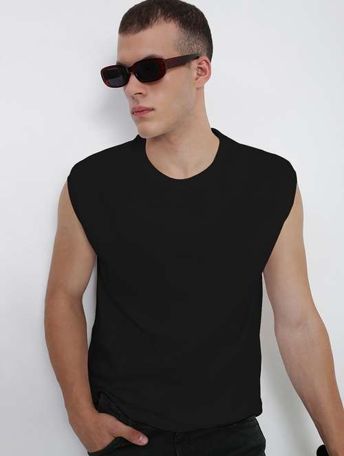 SHOWOFFFF Men's Black Sleeveless Round Neck Regular Fit T-Shirt
