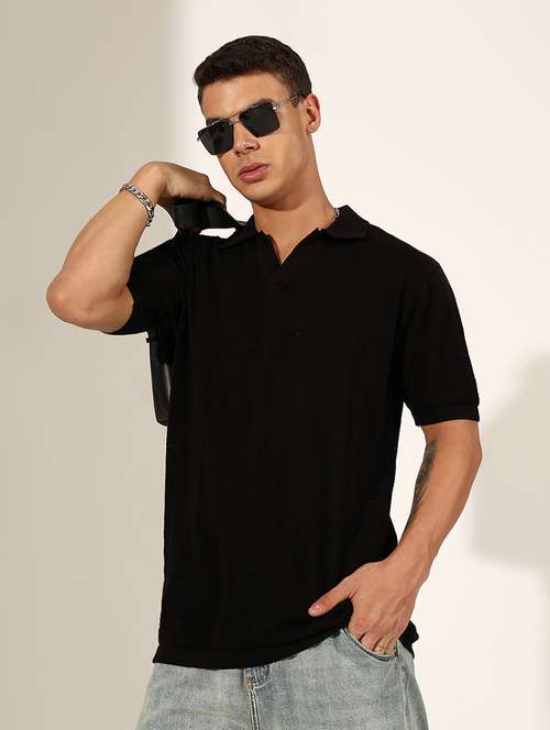 SHOWOFFFF Men's Textured Black Knit Polo T-Shirt with Open Collar