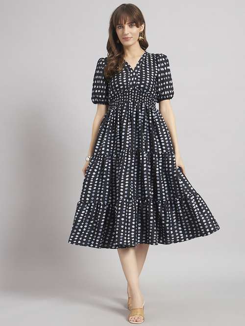 women printed puff sleeve tiered dress