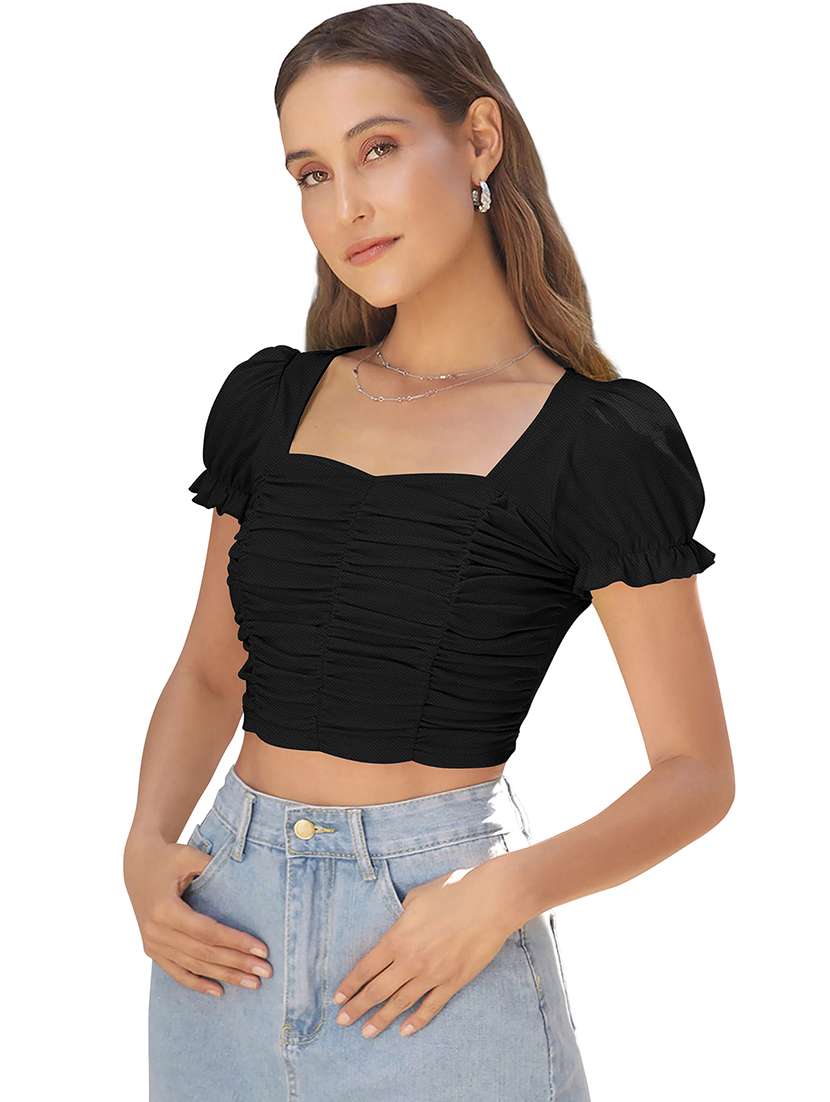 - » women solid puff sleeve ruched crop top