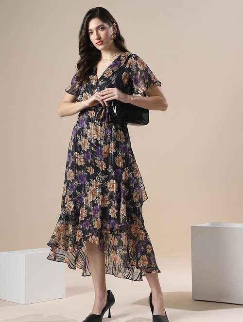 - » globus women black polka dot print wrap neck flared sleeves waist tie-up ruffled tulip hem a-line midi dress