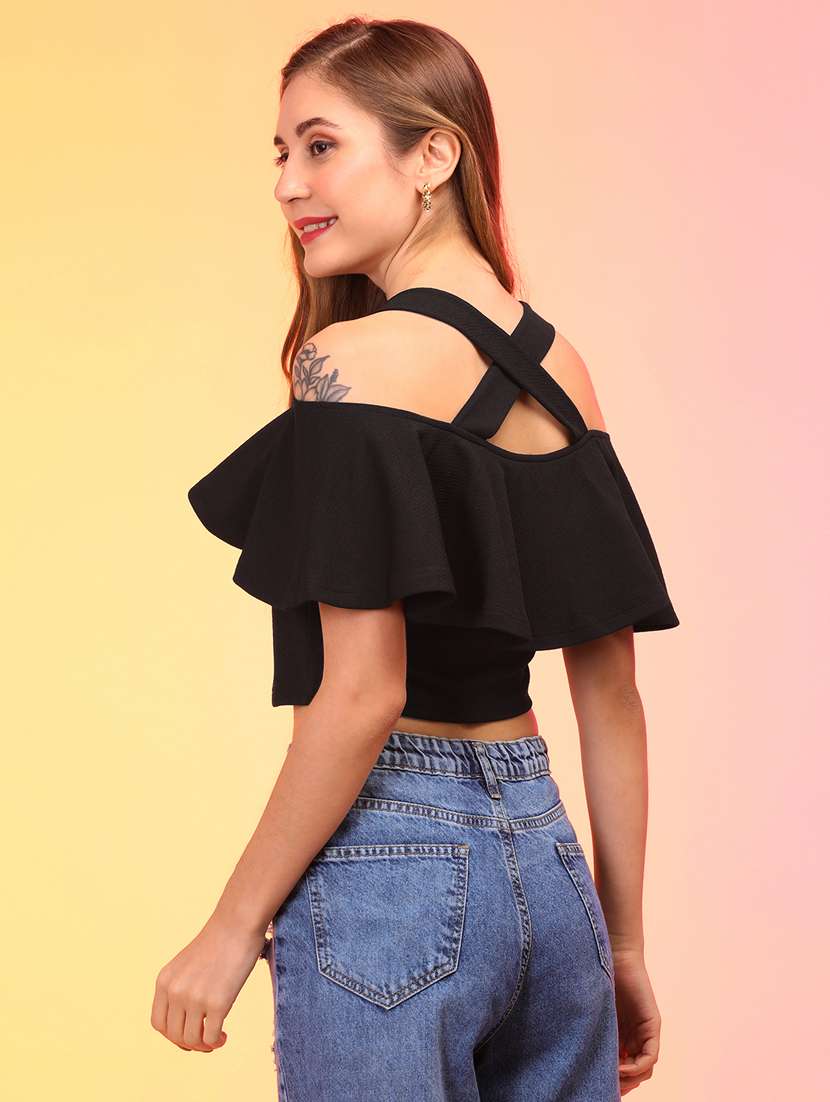 Make a bold fashion statement with our Black Off Shoulder Bardot Crop Top from Globus Women. Designed for summer parties, this polyester top features an off-shoulder bardot neckline and short sleeves for a trendy look. The solid black color exudes sophistication, while the crop silhouette adds a touch of allure. Pair it with high-waisted bottoms for a head-turning ensemble