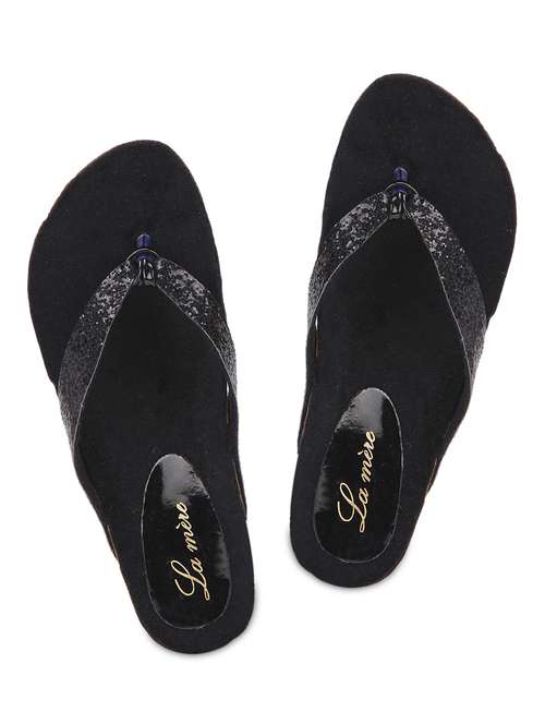 - » black leatherette sandals.