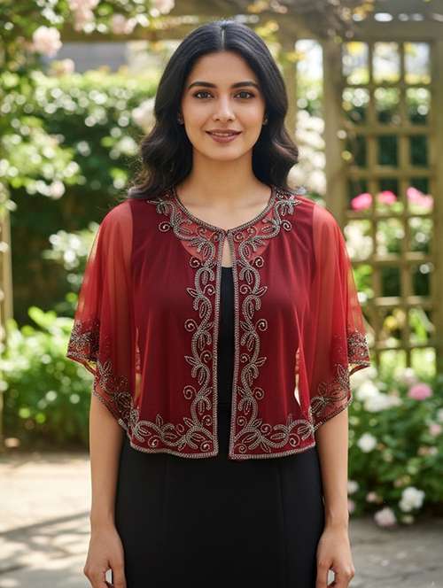 Elevate your evening look with this luxurious women cape. Crafted from delicate net fabric, the free size shrug features exquisite silver and bead embroidery along the border and neckline. This elegant piece perfectly drapes over dresses, offering a sophisticated and comfortable layer for parties and formal events.