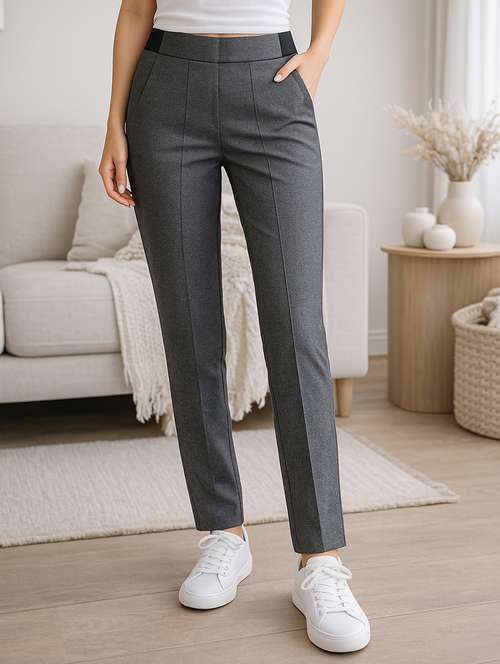 Upgrade your everyday wardrobe with these women’s grey slim-fit trousers, designed to offer the perfect balance of style, comfort, and versatility. Crafted from soft, stretchable fabric, these trousers provide a smooth feel and flexible movement, making them suitable for long workdays or relaxed outings.