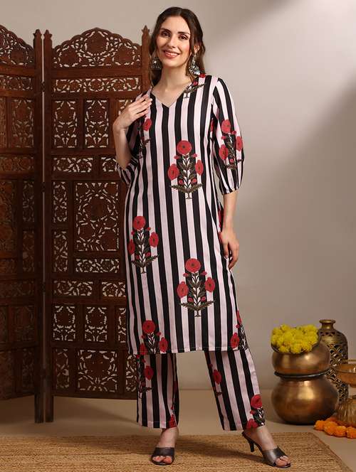 - » globus women black v-neck bishop sleeves striped floral print straight kurta with pants set
