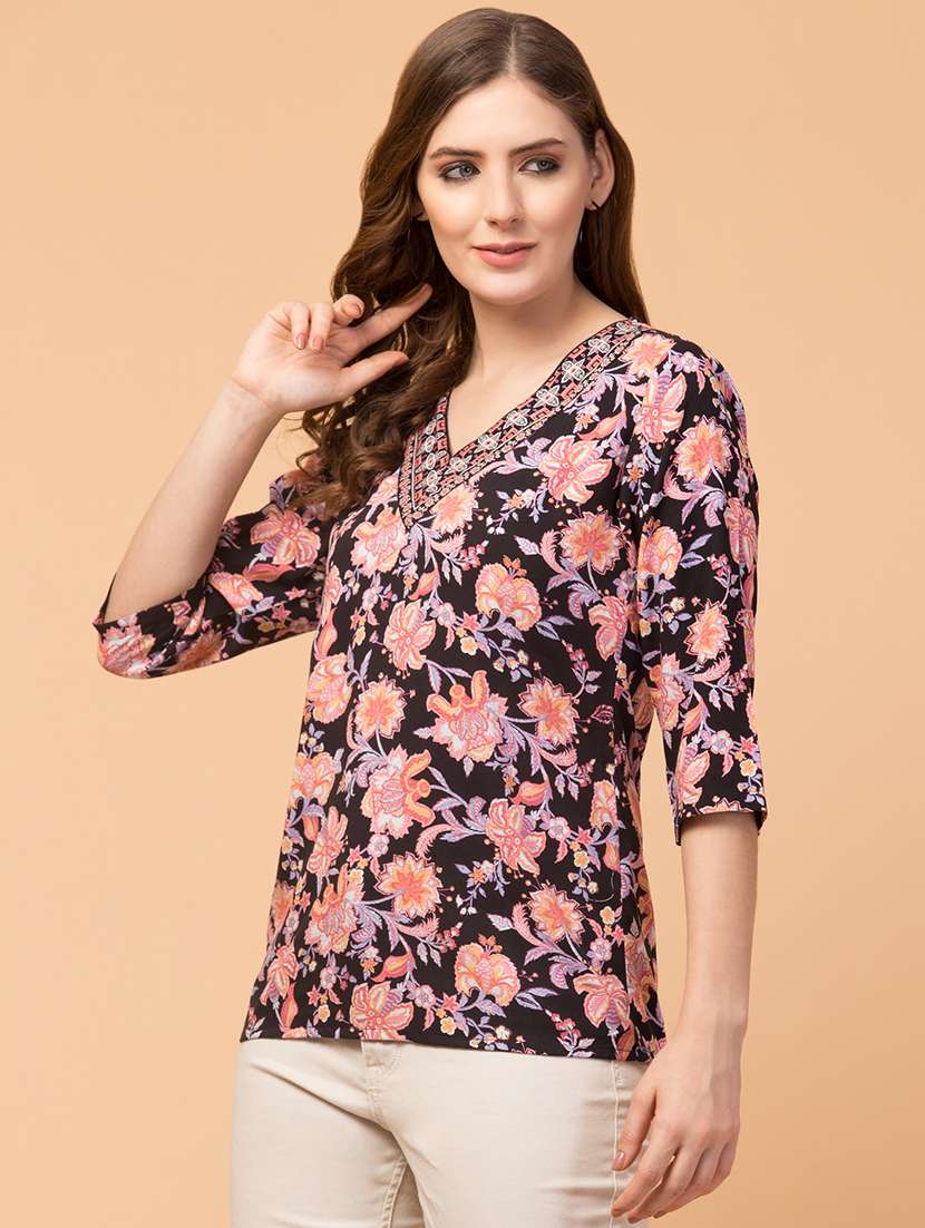 • Opt for this top made up of rayon material and get it in a varied neck design.