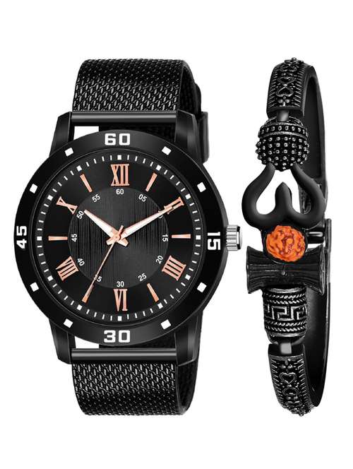 kajaru new fancy stylish - black pu strap & mahadev bracelet combo watch