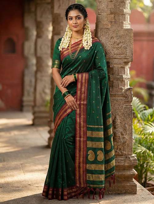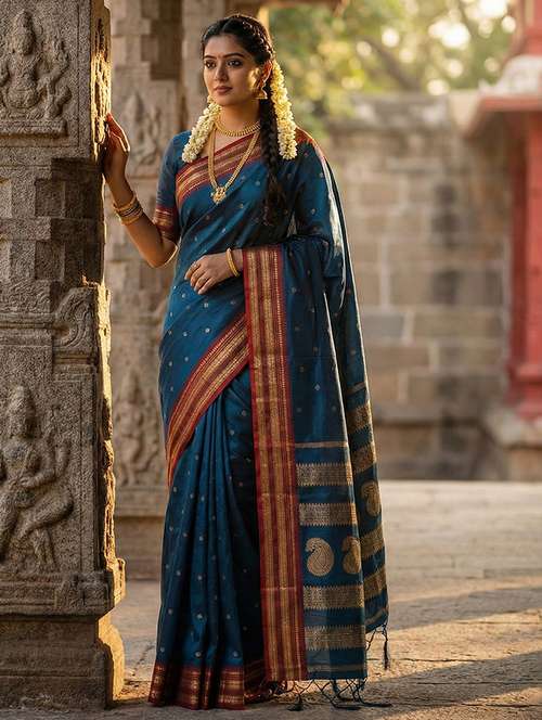 Embrace the allure of the night with this stunning Midnight Black soft silk saree, a masterpiece of understated elegance and traditional charm. The deep, rich black body serves as the perfect canvas for delicate gold zari buttas that glimmer like distant stars. The true showstopper is the contrasting vibrant magenta border, intricately woven with heavy gold zari in classic temple and geometric patterns. The pallu culminates in a grand display of large, traditional paisley (mango) motifs, creating a look that is both trendy and timeless. Crafted from a premium silk blend, it offers a fluid, comfortable drape perfect for evening soirees and festive gatherings. Includes an unstitched magenta blouse piece to complete the sophisticated ensemble.