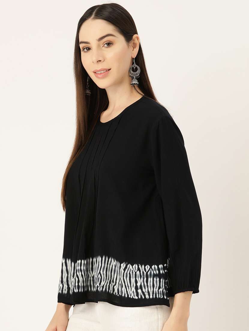 Black Rayon pleated Top,Long Sleeves, tie and dye pattern,Round Neck,Best Quality Comfortable