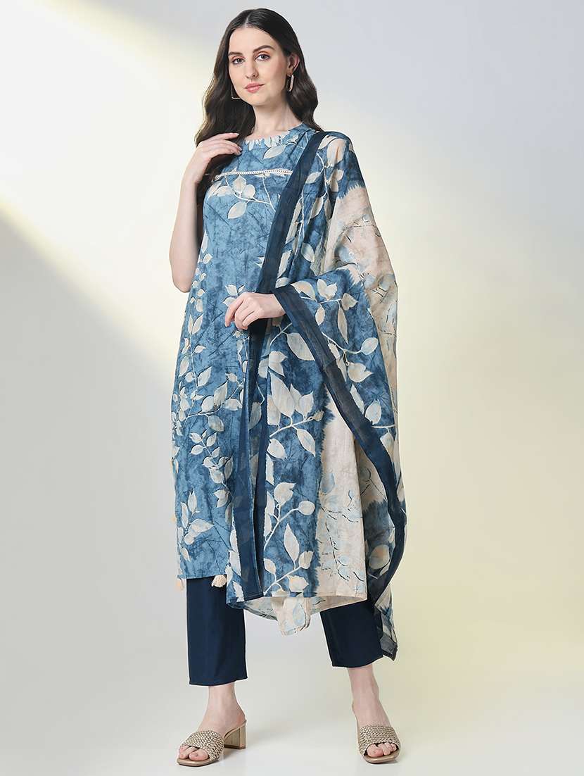 women blue printed sleeveless kurta pant with dupatta set