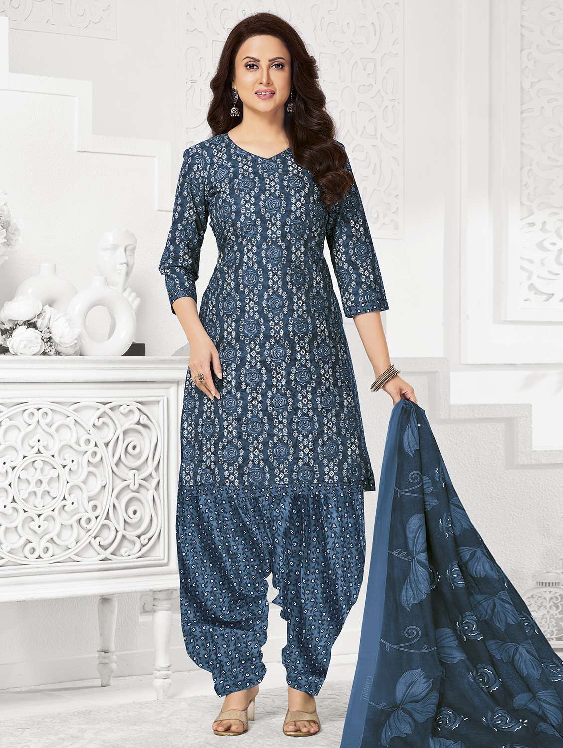 women printed three quarter sleeve kurta patiala with dupatta set