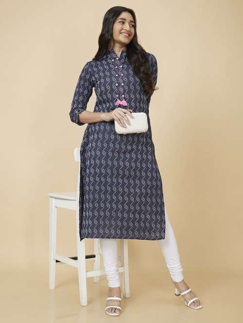 - Grab this beautiful kurta made up of cotton fabric featuring mandarin collar neck designs.