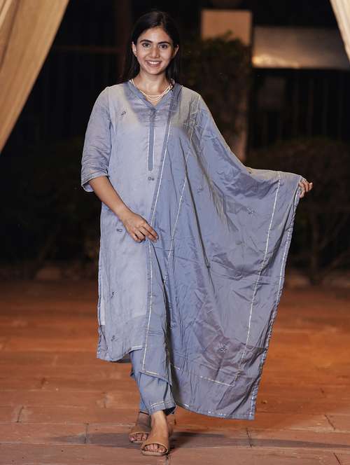 - Find gorgeous sets of ethnic wears in trending designs in grey colors suitable for festive wear of occasions.