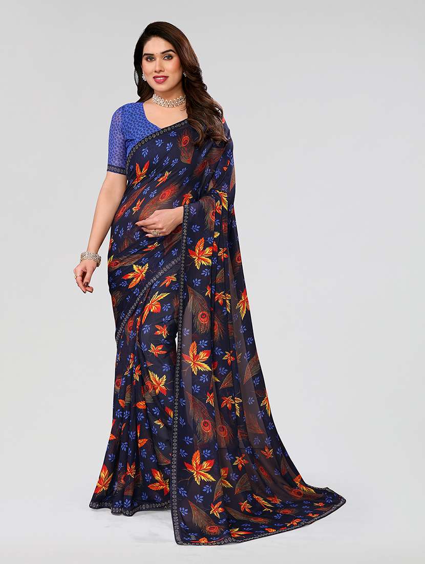 Bring an air of elegance to your wardrobe with this dark blue floral print georgette saree from Our Brand, featuring a delicate lace border for an added touch of sophistication and charm. The lace border frames the saree beautifully, adding a refined touch that enhances its overall appeal. Ideal for daily wear, casual outings, or semi-formal occasions, this saree combines style and comfort effortlessly.