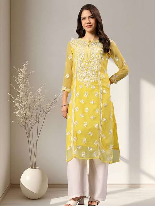 - Grab this beautiful kurta made up of georgette fabric featuring notch neck designs.