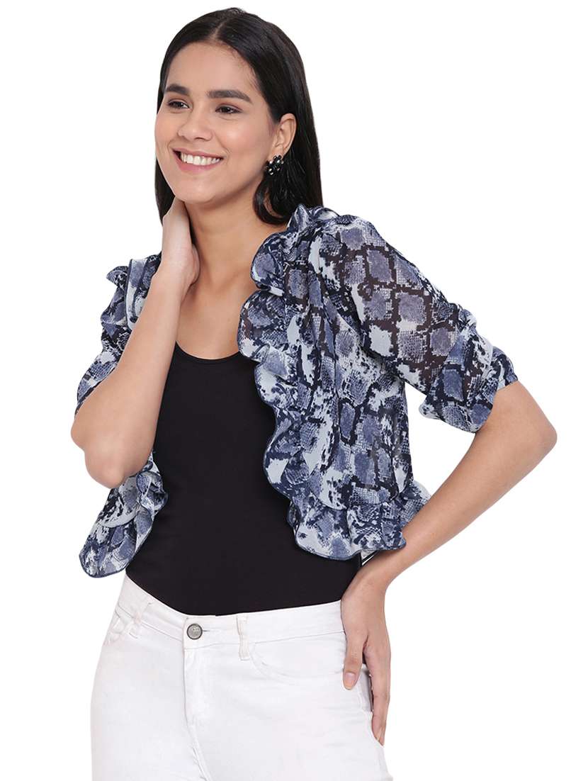 - » snake print ruffled sheer shrug