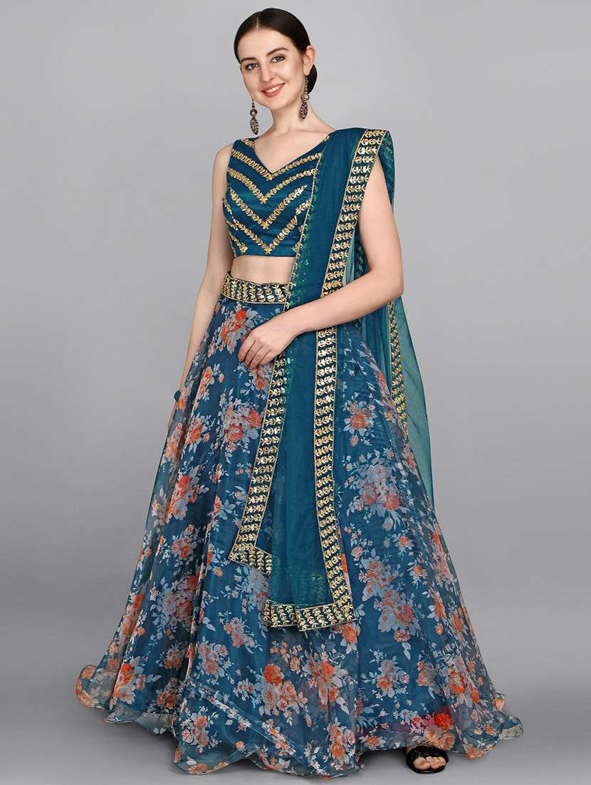 - » teal blue embroidered & sequence work floral semi-stitched lehenga choli with dupatta