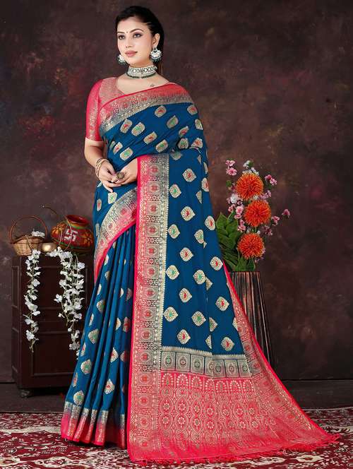 Rama Blue Dola Silk Saree with Contrast Pink Border & Golden Zari Weaving