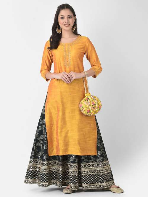 - Grab this beautiful kurta made up of silk fabric featuring round neck designs.