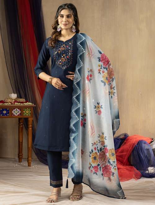- Find gorgeous sets of ethnic wears in trending designs in navy blue colors suitable for festive wear of occasions.