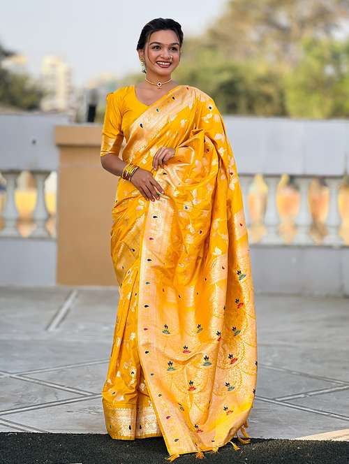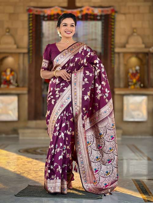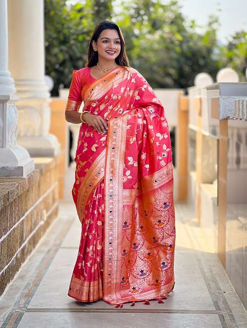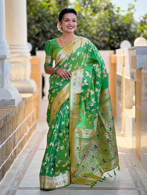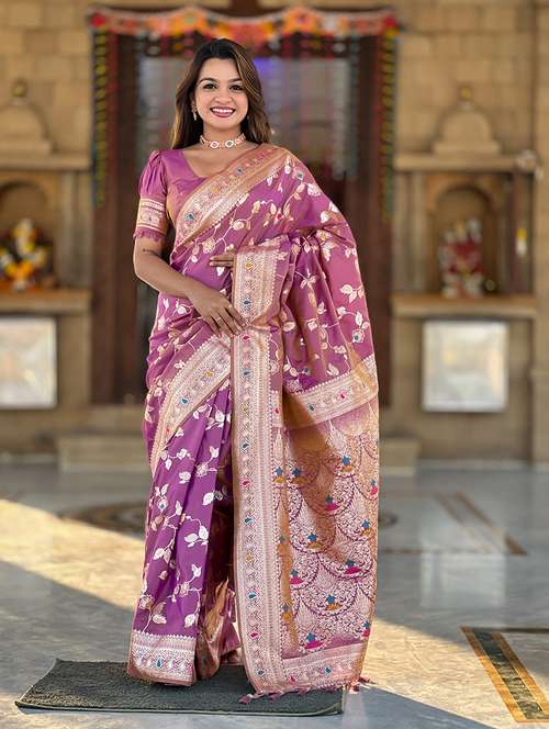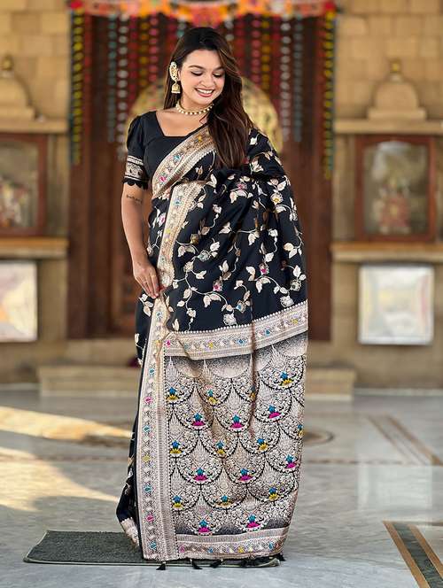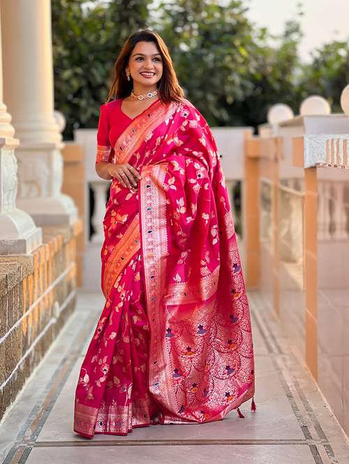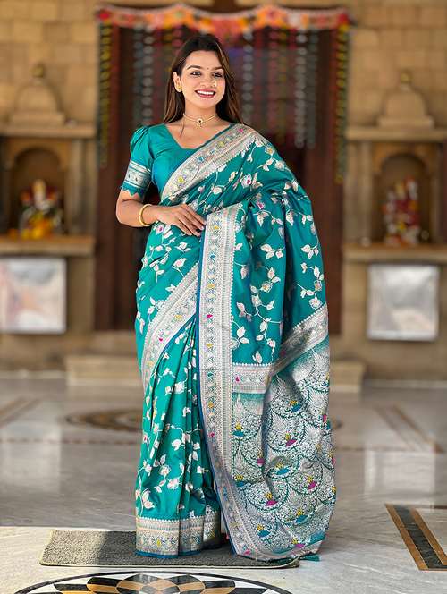 We offers Banarasi Softy Silk Saree with Rich intricate Golden Zari Meenakari Jacquard work at all over body, Border & Grand Pallu. Blouse, Border and Pallu have very fine zari matching with Saree body. Saree has beautiful zalar (Tessel) work at pallu. Saree & Blouse Material is Litchi Silk which very Soft and Skin Friendly material. This Saree has a Length 6.30 Meter Which Includes 0.8 meters of the blouse. These new Bollywood designer fashionable saree for women can be used as Party wear saree, Festival saree, wedding saree on every Occasions. Product colour may slightly very due to photographic lighting sources or your monitor settings.
