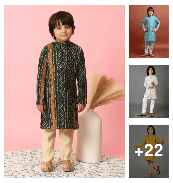 boys printed long sleeve kurta & pyjama set
