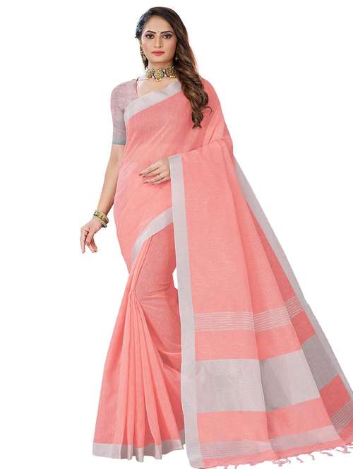 women's solid peach colored saree with blouse