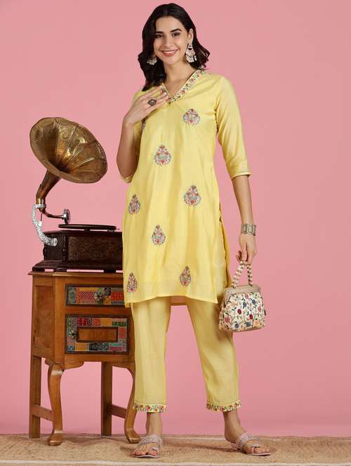 women embroidered three quarter sleeve kurta pant with dupatta set