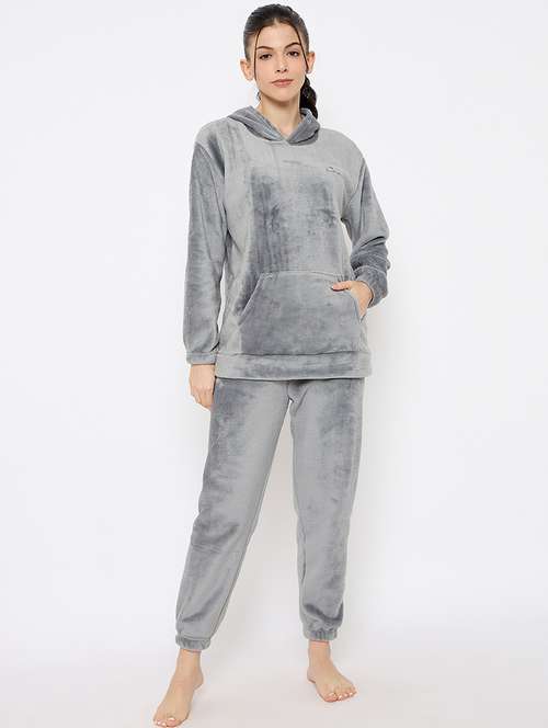 women solid hooded nightwear pyjama set