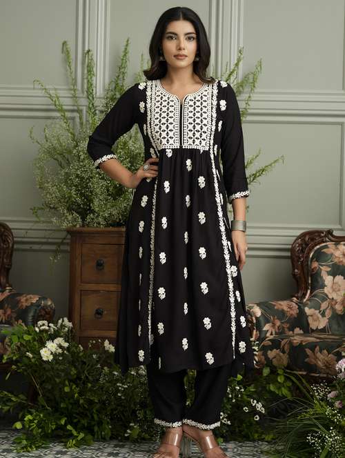 women solid with work three quarter sleeve kurta pant set