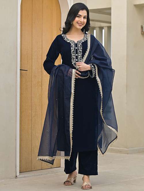 women long sleeve embroidered winter wear kurta pant with dupatta set