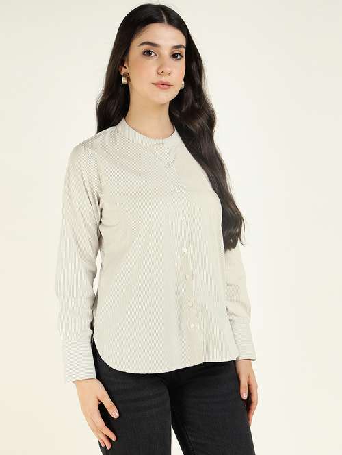 women striped mandarin collared long sleeve shirt