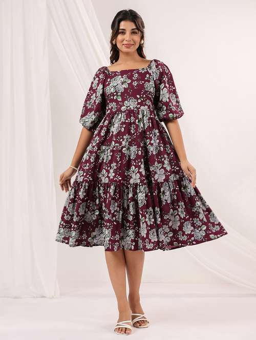 women floral printed puff sleeve tiered dress