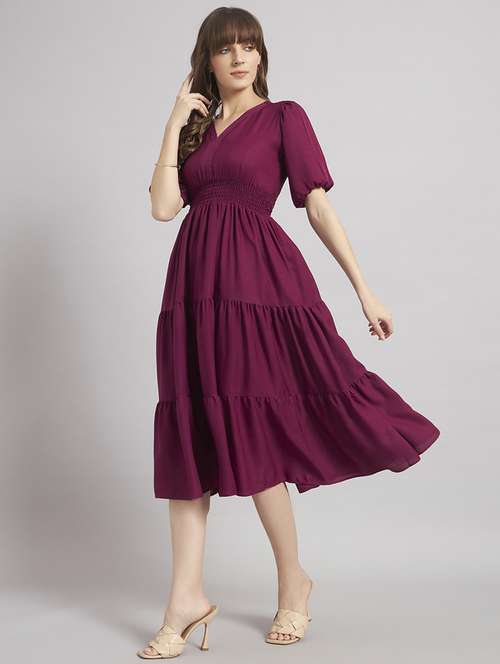 women solid puff sleeve tiered dress