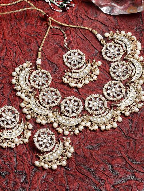 gold plated white plearl chand shape kundan necklace earrings and maang tikka set