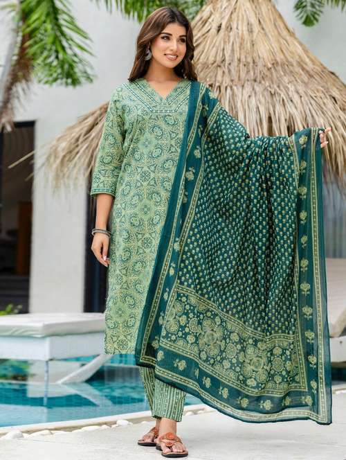 women printed three quarter sleeve kurta pant with dupatta set