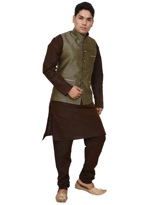 brown silk blend kurta pyjama with jacket ethnic wear set