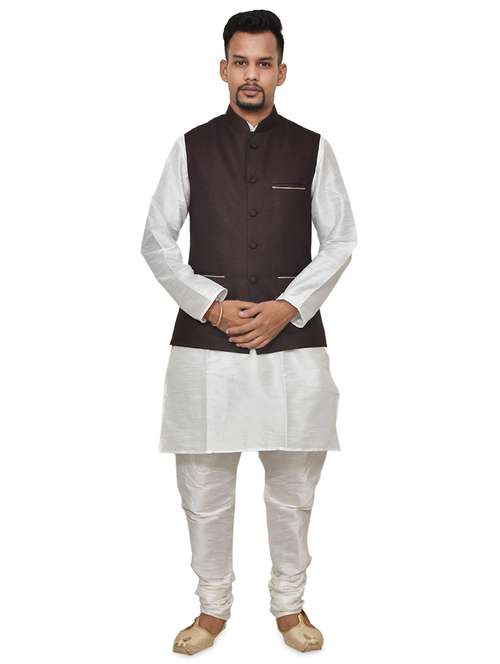 brown silk blend kurta pyjama with jacket ethnic wear set