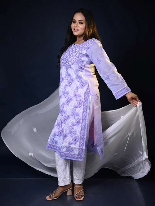 women solid with work three quarter sleeve kurta pant with dupatta set