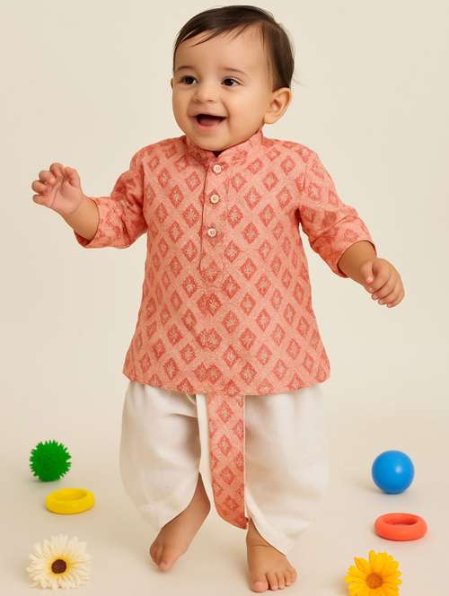 boys printed long sleeve kurta & dhoti set