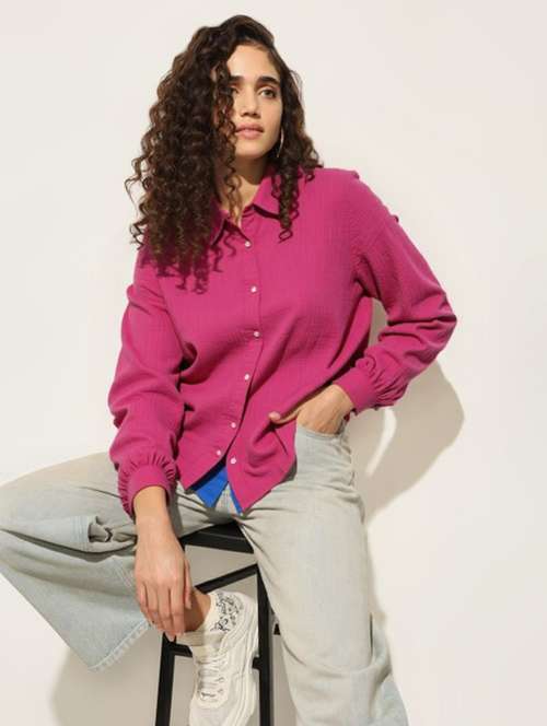 women solid collared long sleeve relaxed fit shirt