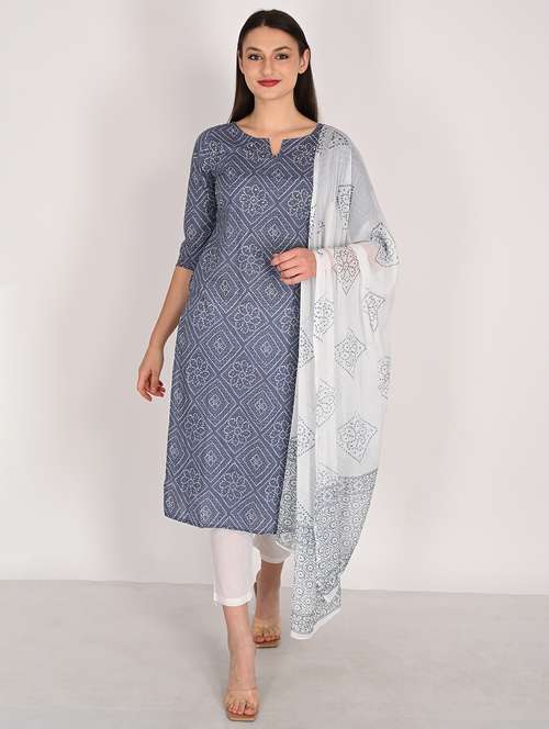 women printed three quarter sleeve kurta salwar with dupatta set